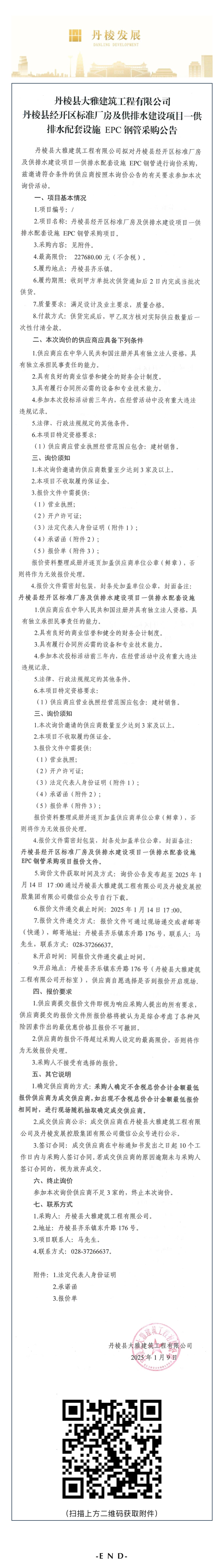 丹棱縣大雅建筑工程有限公司丹棱縣經(jīng)開區(qū)標(biāo)準(zhǔn)廠房及供排水建設(shè)項(xiàng)目一供排水配套設(shè)施 EPC鋼管采購(gòu)公告