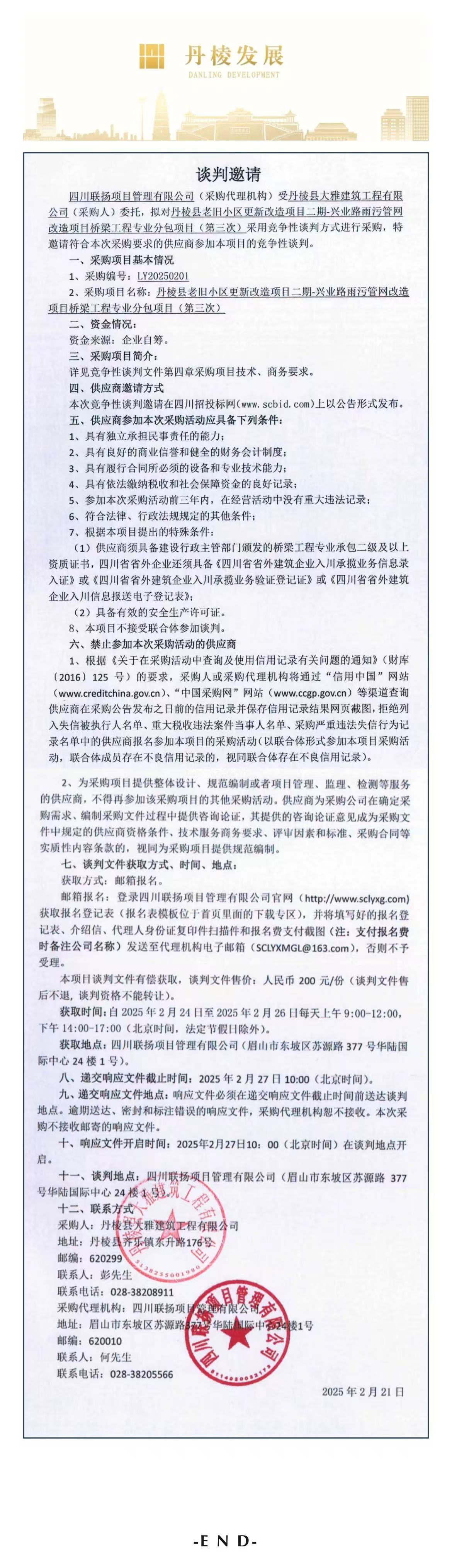 丹棱縣老舊小區(qū)更新改造項(xiàng)目二期-興業(yè)路雨污管網(wǎng)改造項(xiàng)目橋梁工程專(zhuān)業(yè)分包項(xiàng)目談判邀請(qǐng)公告(第三次)