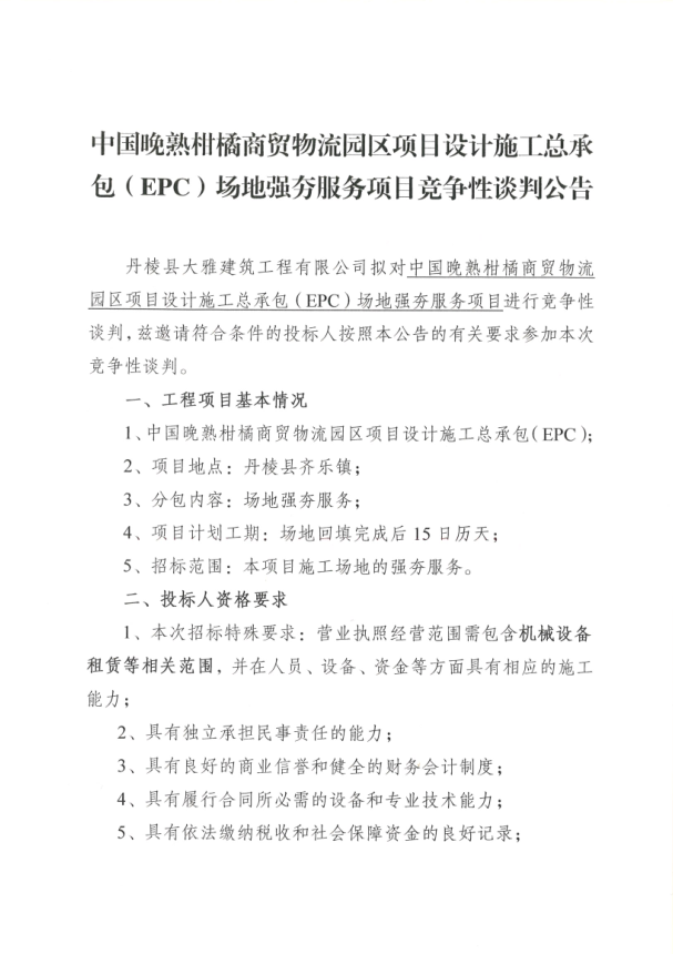 【大雅建筑公司】中國晚熟柑橘商貿(mào)物流園區(qū)項目設(shè)計施工總承包(EPC)場地強夯服務(wù)項目競爭性談判公告