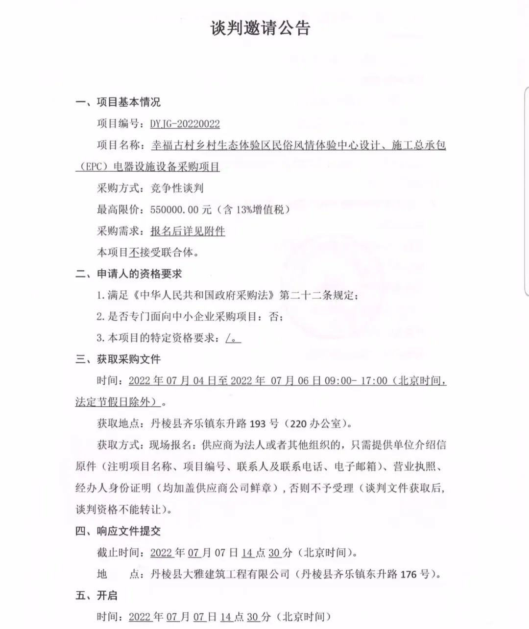 幸福古村鄉(xiāng)村生態(tài)體驗區(qū)民俗風(fēng)情體驗中心設(shè)計、施工總承包(EPC)電器設(shè)施設(shè)備采購項目談判邀請公告