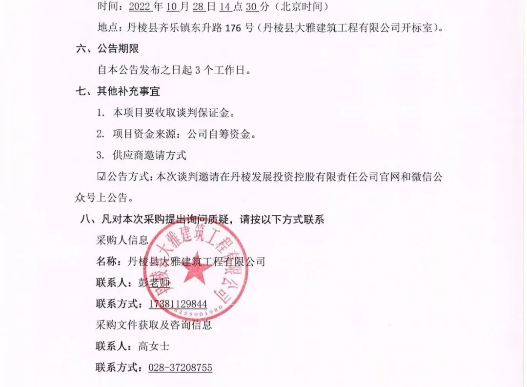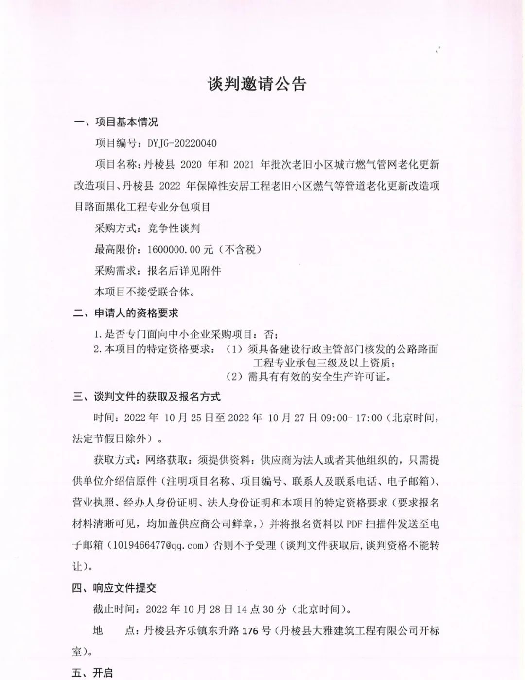 丹棱縣 2020 年、 2021 年、 2022 年保障性安居工程老舊小區(qū)燃?xì)獾裙艿览匣赂脑祉?xiàng)目路面黑化工程專(zhuān)業(yè)分包項(xiàng)目談判邀請(qǐng)公告