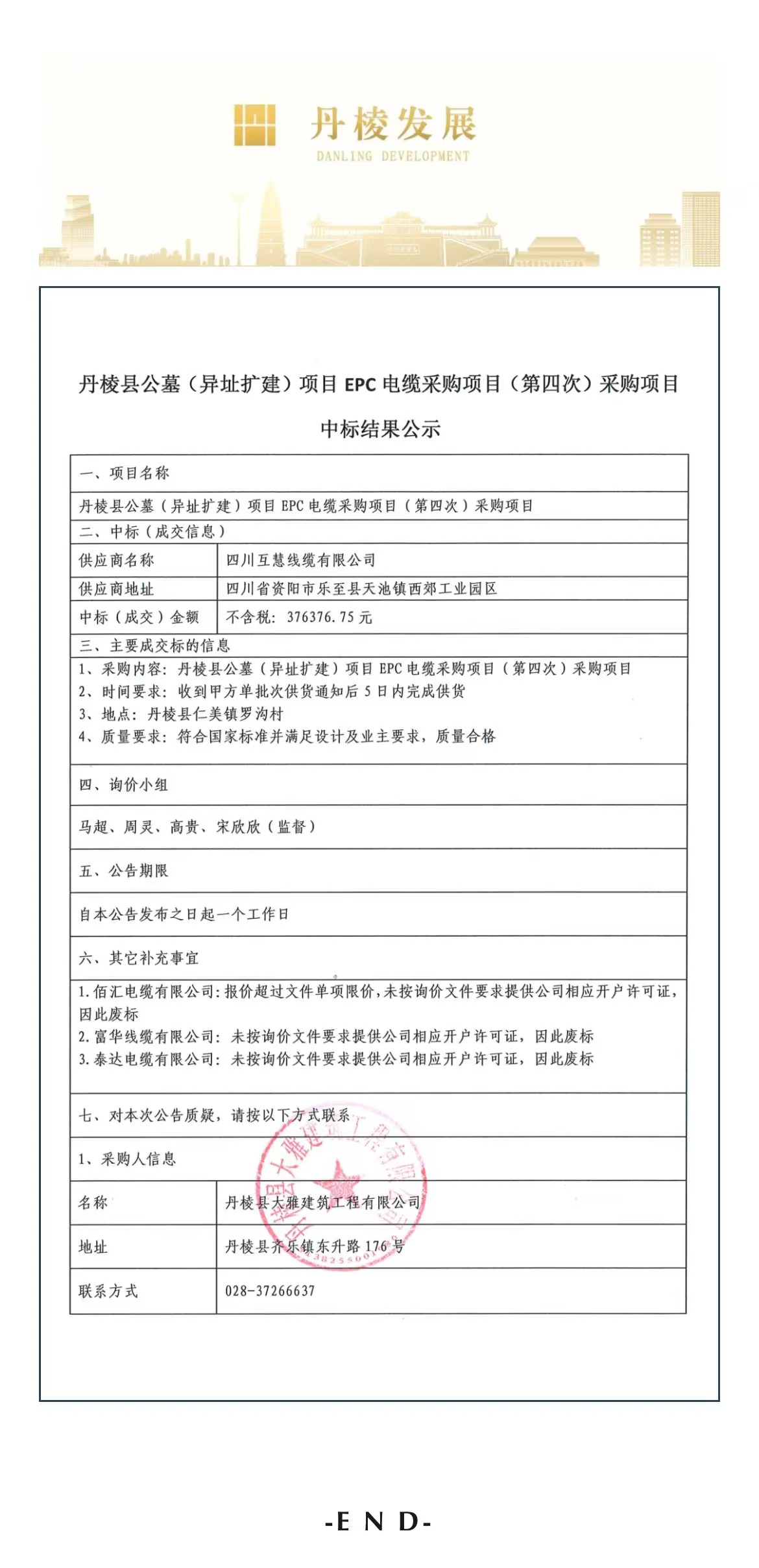 丹棱縣公墓(異址擴(kuò)建)項(xiàng)目EPC電纜采購項(xiàng)目(第四次)采購項(xiàng)目中標(biāo)結(jié)果公示