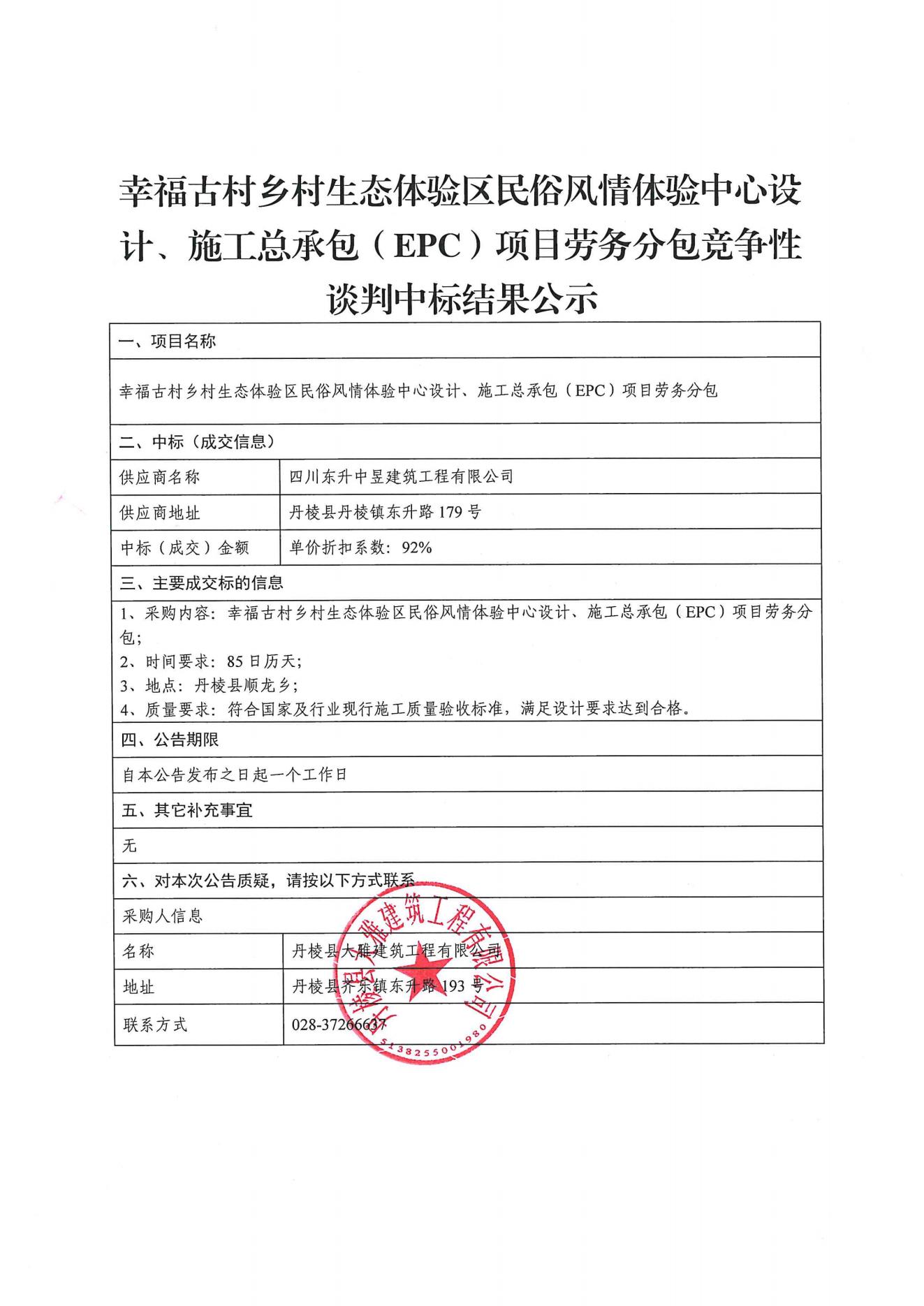 【大雅建筑公司】幸福古村鄉(xiāng)村生態(tài)體驗區(qū)民俗風情體驗中心設計、施工總承包(EPC)項目勞務分包競爭性談判中標結(jié)果公示