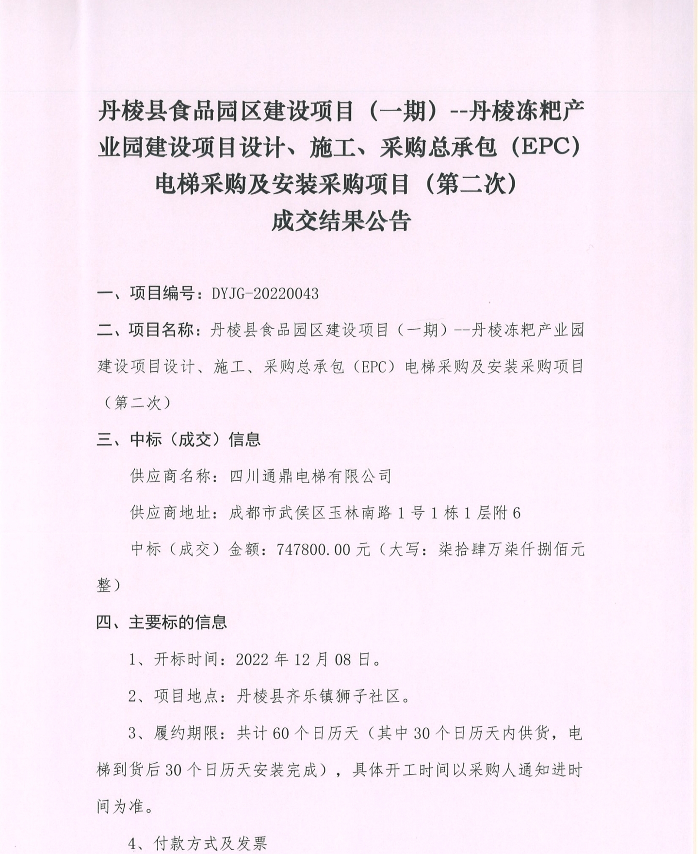 丹梭縣食品園區(qū)建設(shè)項目 (一期) --丹棱凍粑產(chǎn)業(yè)園建設(shè)項目設(shè)計、施工、采購總承包 (EPC)電梯采購及安裝采購項目 (第二次)成交結(jié)果公告