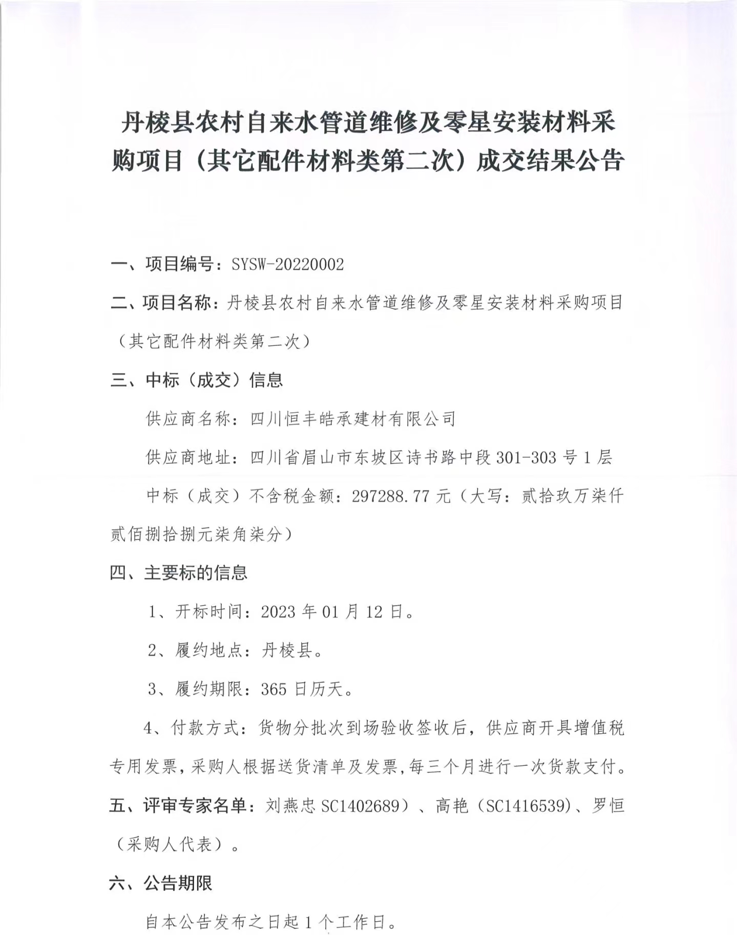 丹棱縣農(nóng)村自來(lái)水管道維修及零星安裝材料采購(gòu)項(xiàng)目(其它配件材料類第二次) 成交結(jié)果公告