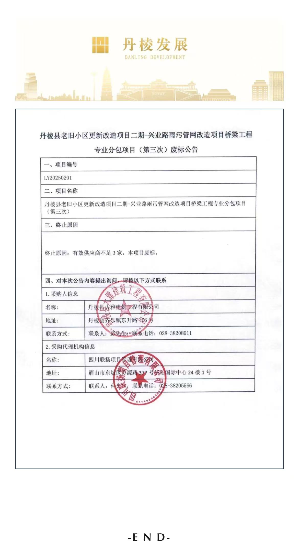 丹棱縣老舊小區(qū)更新改造項目二期-興業(yè)路雨污管網改造項目橋梁工程專業(yè)分包項目(第三次)廢標公告