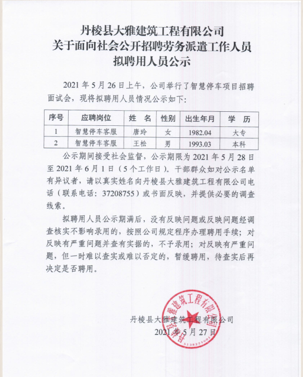 【大雅建筑公司】 關(guān)于面向社會(huì)公開招聘勞務(wù)派遣工作人員 擬聘用人員公示