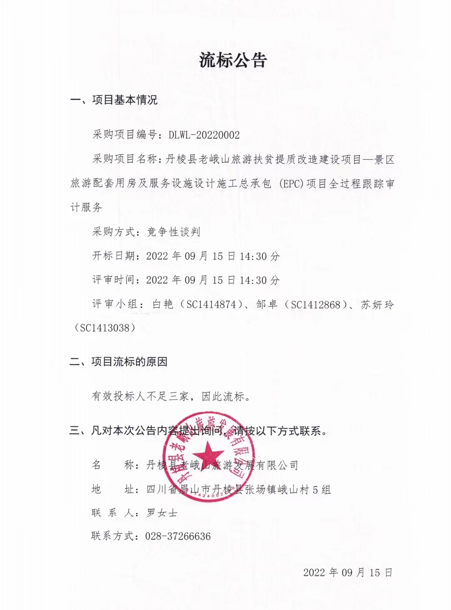丹棱縣老峨山旅游扶貧提質(zhì)改造建設(shè)項(xiàng)目--景區(qū)旅游配套用房及服務(wù)設(shè)施設(shè)計(jì)施工總承包(EPC)項(xiàng)目全過(guò)程跟蹤審計(jì)服務(wù)流標(biāo)公告