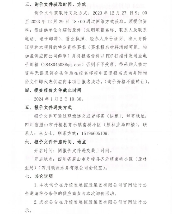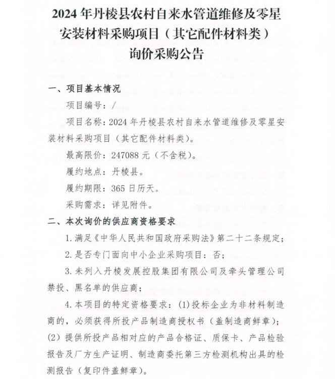 2024年丹棱縣農村自來水管道維修及零星安裝材料采購項目 (其它配件材料類 )詢價采購公告