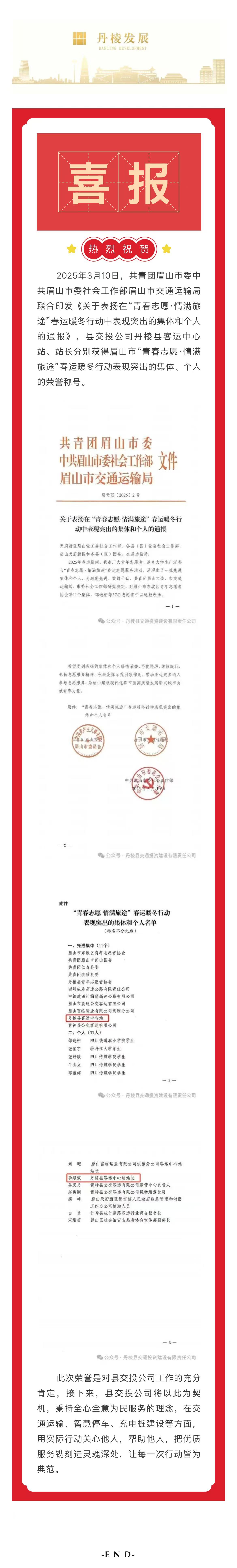 【縣交投公司】喜報!丹棱縣客運中心站、站長分別獲得眉山市“青春志愿·情滿旅途”春運暖冬行動表現(xiàn)突出的集體、個人榮譽(yù)稱號